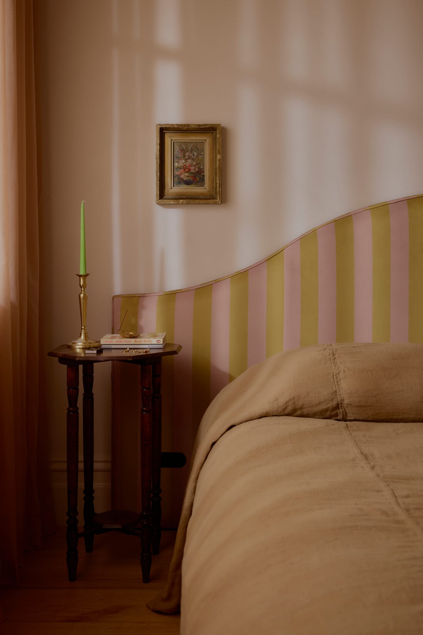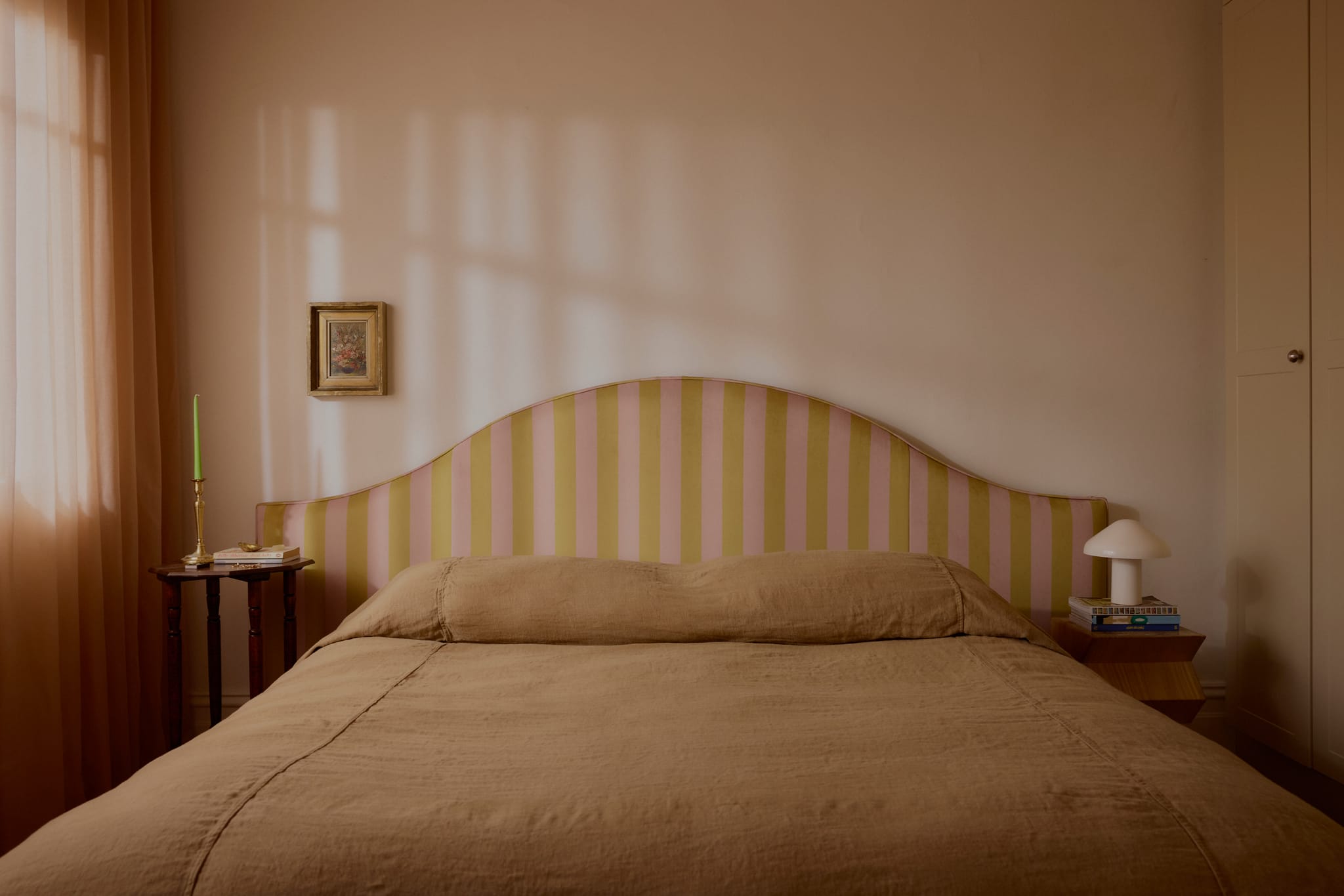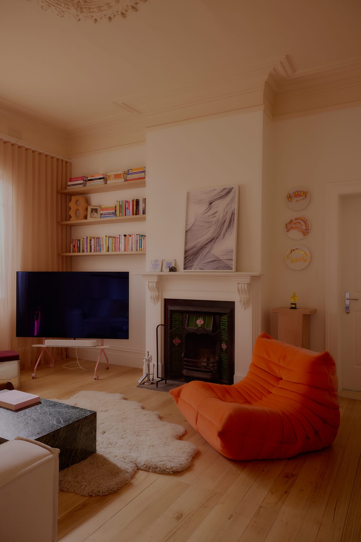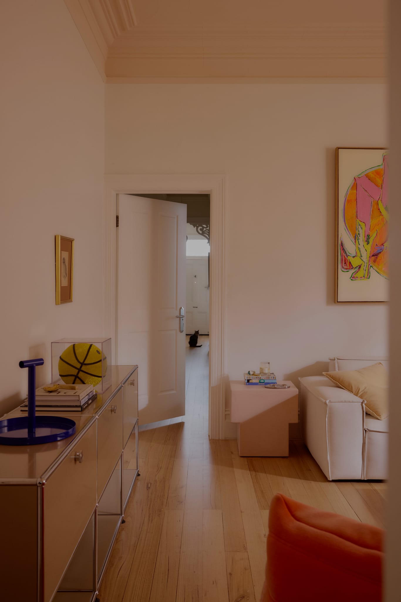 The interior has been overhauled and utterly transformed. What results is a home that glows with a dreamy, pinkish hue, making it feel deeply filmic and redolent with an enigmatic ambience. Floor-length net curtains flutter and flow, drenching the rooms with dappled light, whilst a baseline of creamy, neutral tones highlight brighter elements like neon features and brightly toned paintings and fabrics. “Our home is very much a culmination of our two personalities,” state the couple. “While Cate leans toward a vintage, old-world style, Dylan brings his love of contemporary pieces that are full of colour. Together we have developed an appreciation for each other’s styles and created what we feel is a unique vibe.