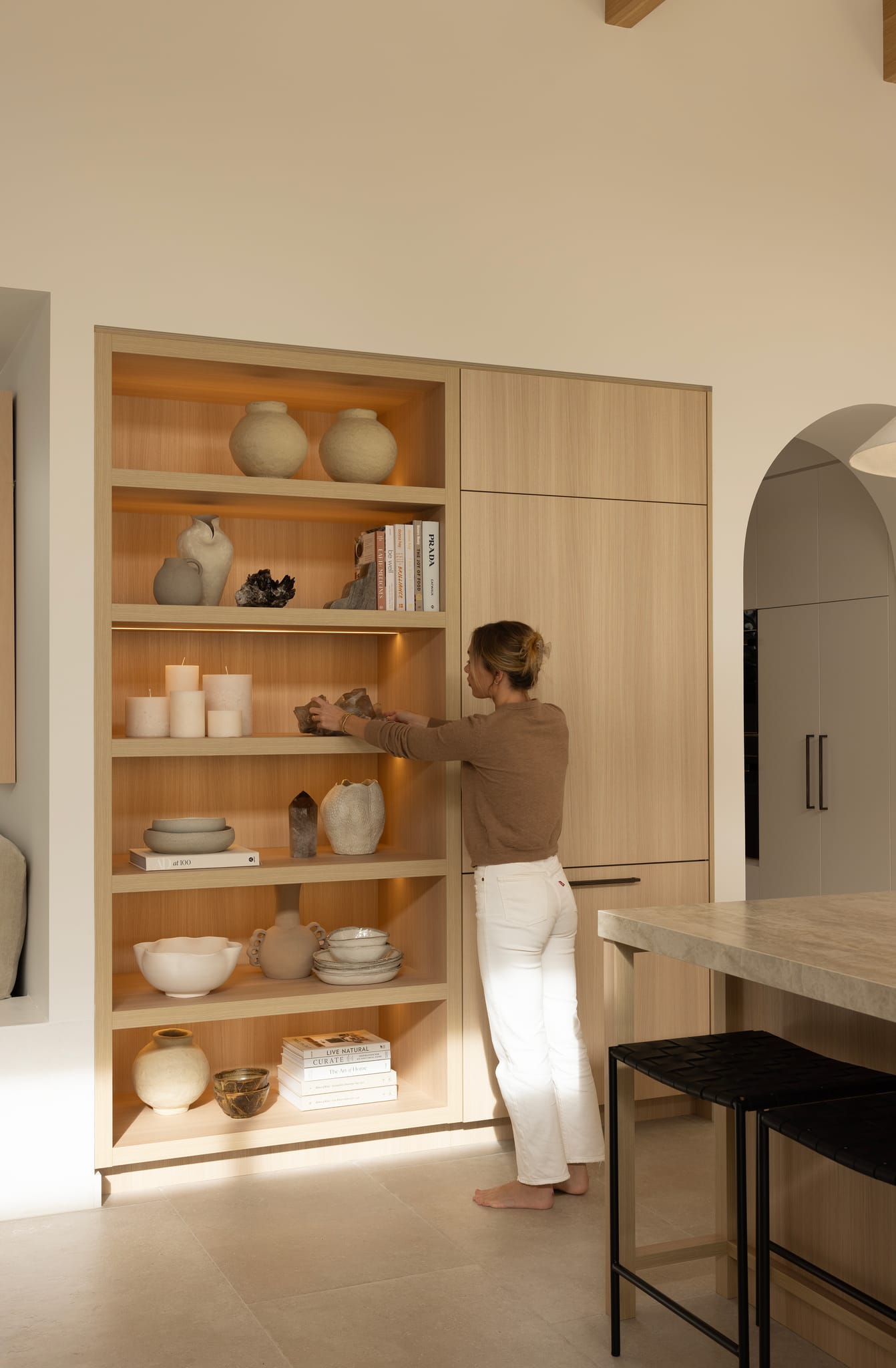 The living area, which once featured multiple rooms running into each other via brick archways, has been opened up, the ceilings heightened and the glazing exaggerated to capture the light. Open shelving in the kitchen reveals the couple’s collection of artisanal ceramics, Iver’ Brunswick Cabinet Pulls ornamenting the cabinet doors with deft subtlety. In the dressing room, with its soft under-foot carpeting and fabric-lined cupboards, Iver Helsinki T Cabinet Pulls complete the home’s contemporary vision. “The detail, quality and finish options always make Iver an easy selection for us,” says Studio Haus.