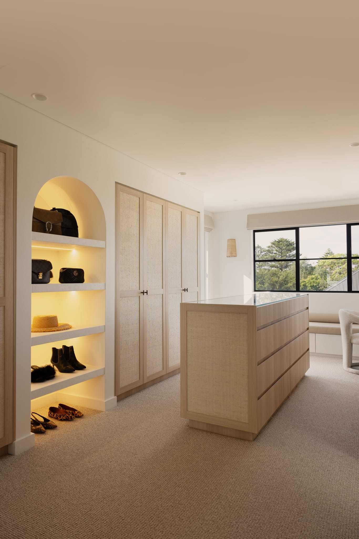 The primary bedroom is calm and inviting. “The main bedroom looks out over Gunnamatta Bay,” reveals Studio Haus. While the views remain as something to admire, every room inside Casa Olea now equals them in prestige. It’s a home that feels softened, welcoming, and anchored in light and texture.