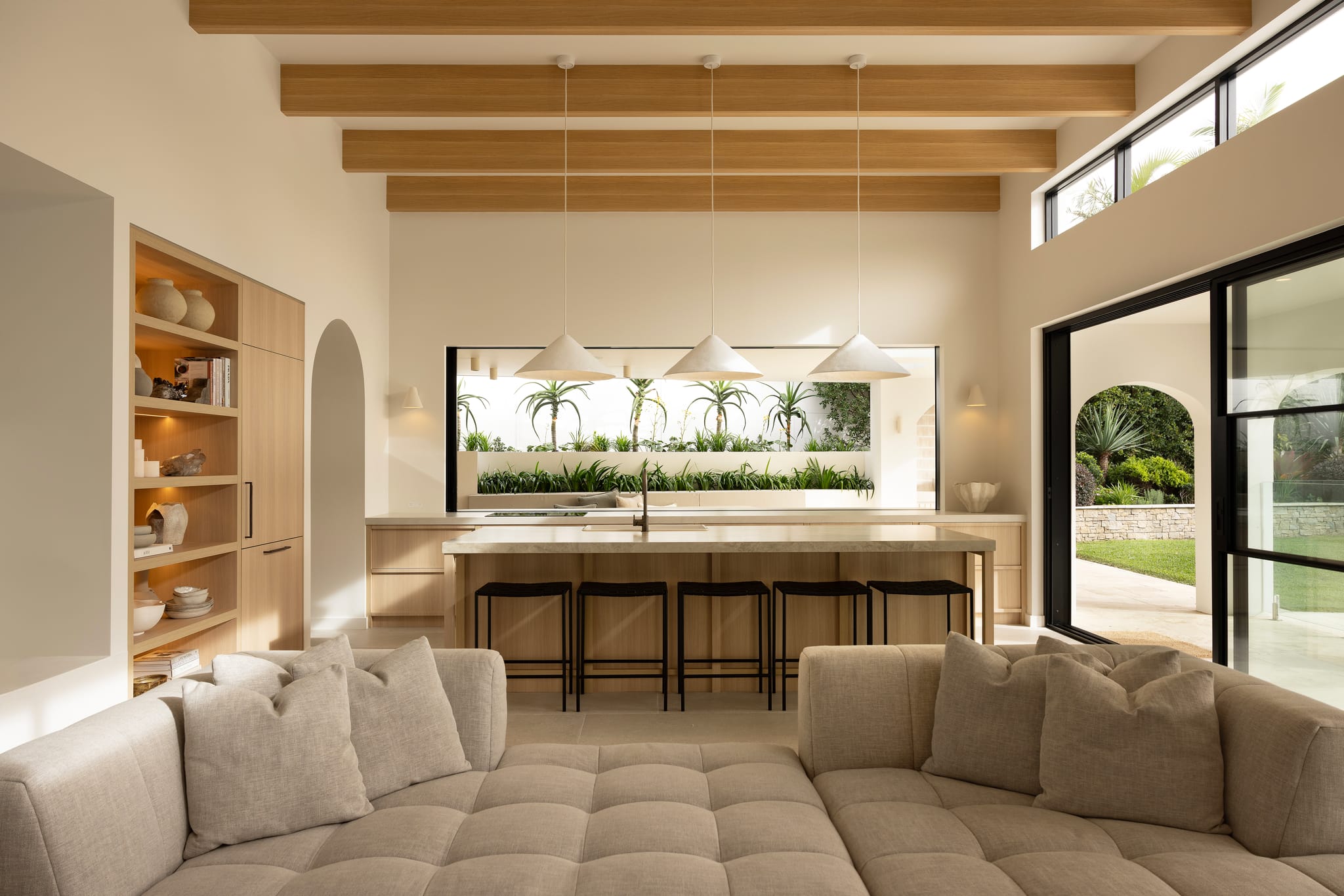 Casa Olea in its previous incarnation was very different to what it is today. “Before the build, the property had a distinct Italian influence,” says Studio Haus. “The previous owners, being Italian, had incorporated strong Mediterranean design elements throughout. It featured prominent arches, decorative tiling, and a solid brick base that gave it a heavy, traditional feel.” The exposed bricks throughout felt dated and tired, and the low ceilings dampened, rather than celebrated, the glistening Sutherland Shire light. “Our goal was to open up the home and transform it into a light-filled space with distinct zones for entertaining and sharing with friends and family,” continues Studio Haus.