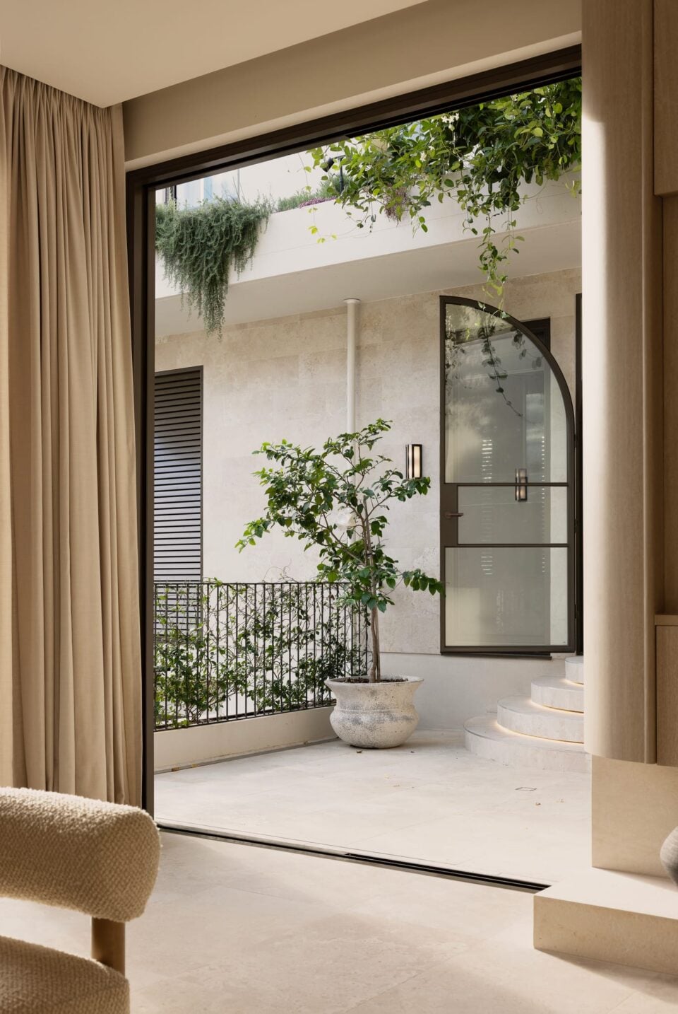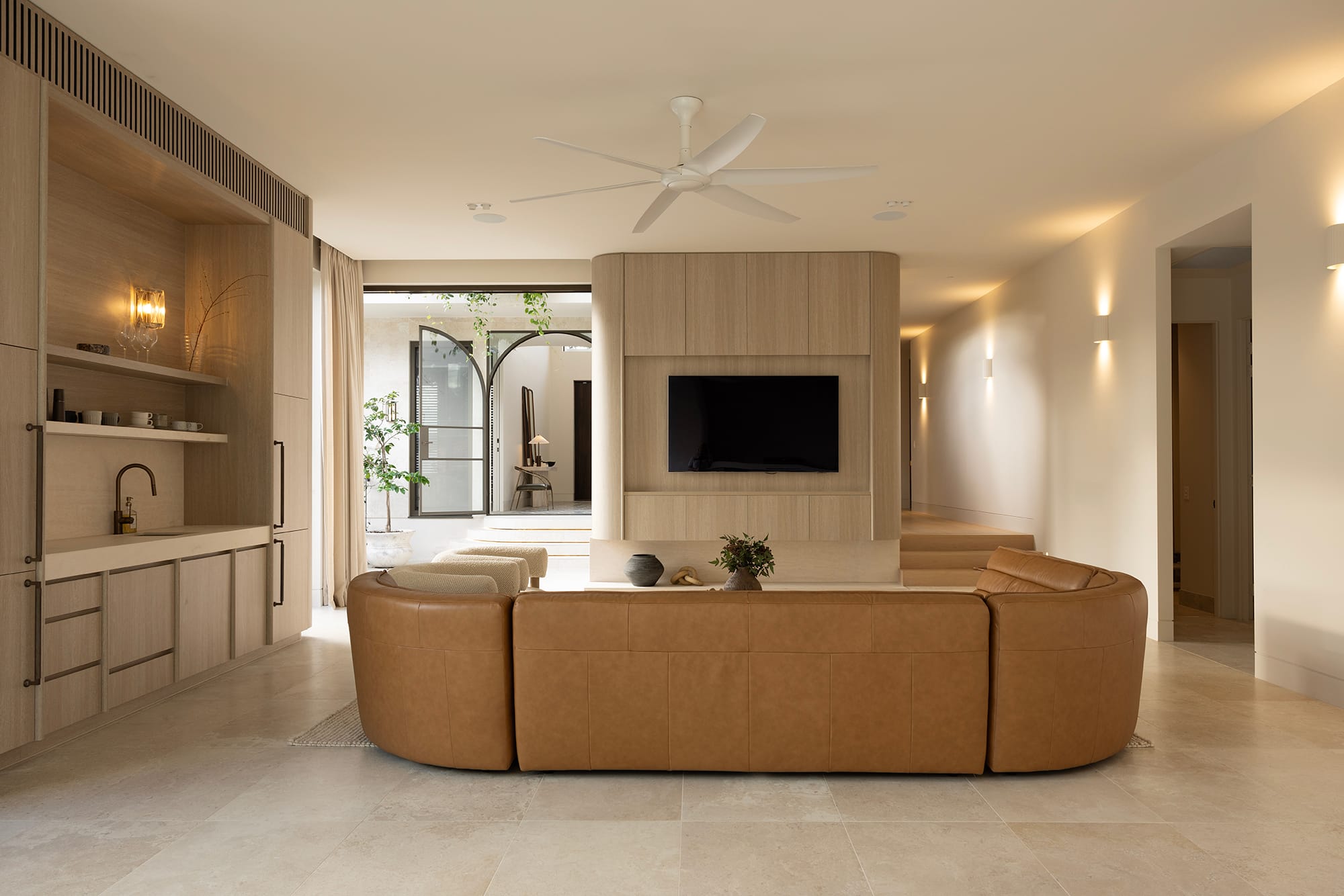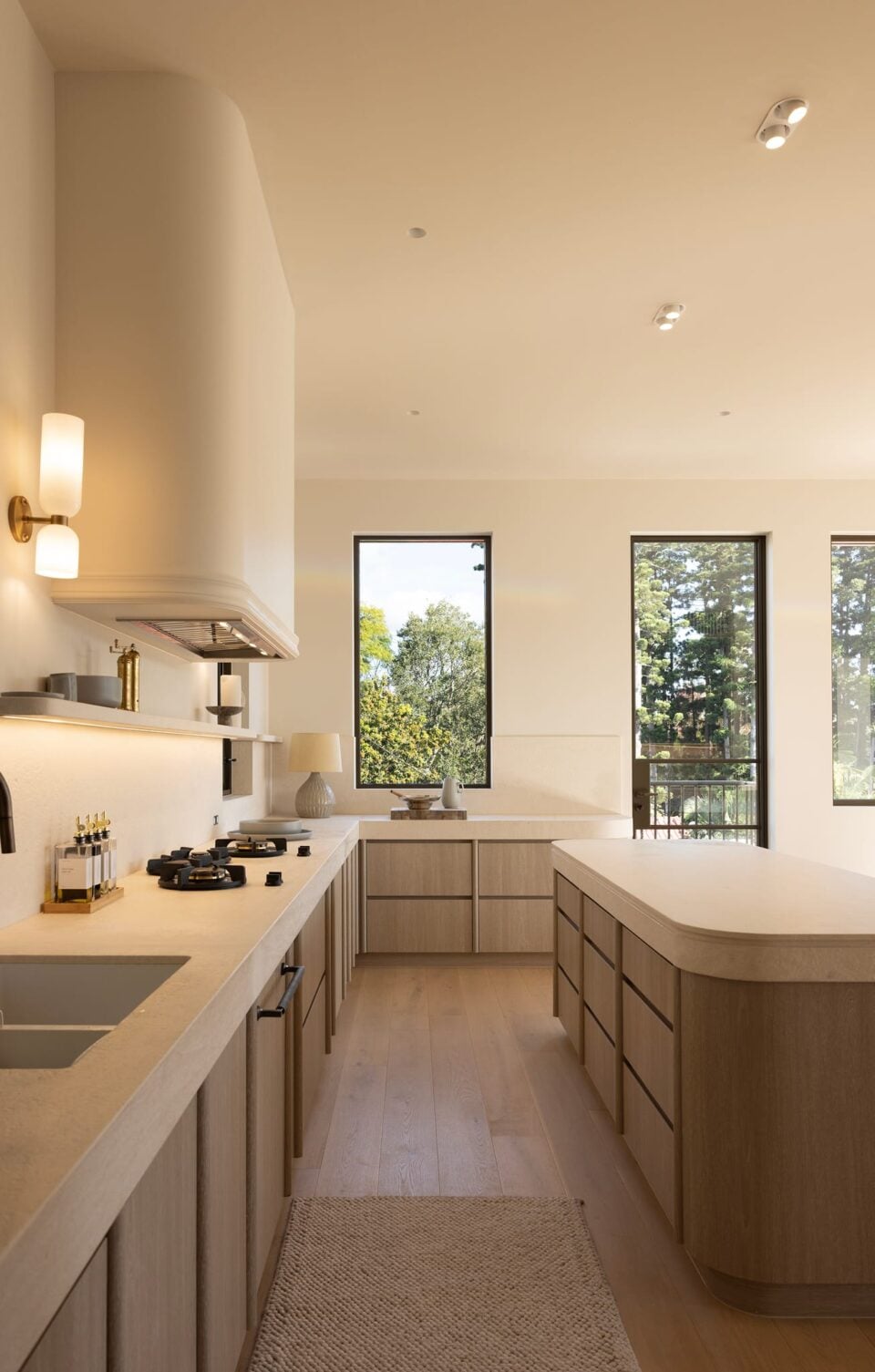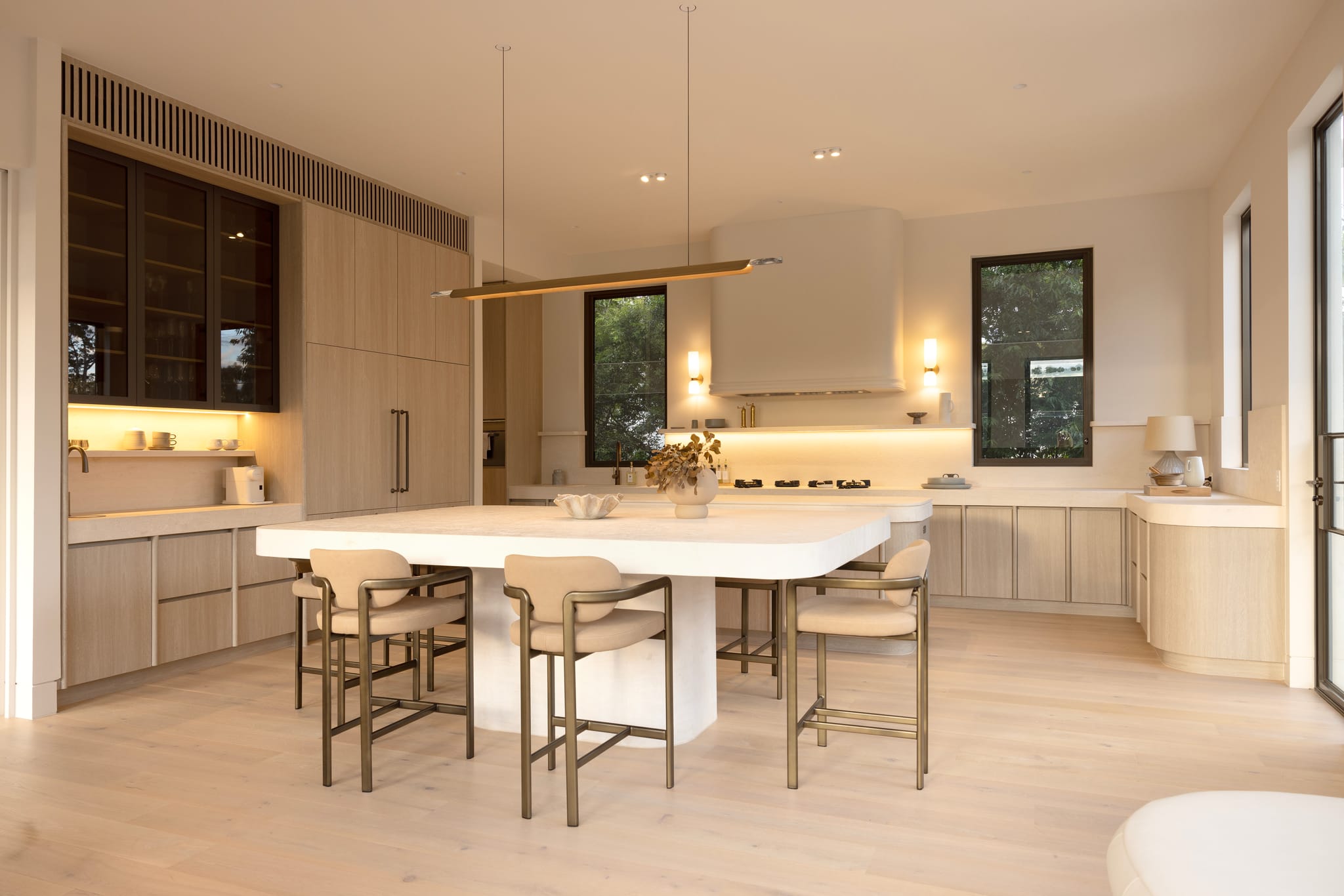 “This project was a 2–3-year design and construction journey located in Chelmer, Brisbane, positioned to take full advantage of views over the Brisbane River,” they say. “The home is a contemporary build with classic architectural throwbacks, balancing modern form with timeless detail.” To achieve this, the building itself leans towards the linear, with the interior elements — like the curvaceous kitchen island, rounded coffee bar, sofas and armchairs, not to mention the surrounding natural landscape — more inclined towards the organic. “The structural approach combined clean, simple lines with high-quality natural materials, including stone and steel-framed windows,” continue the architects. “Extensive landscaping was designed to soften the overall form. The result is a spacious, refined residence with an emphasis on light, proportion, and material integrity.”