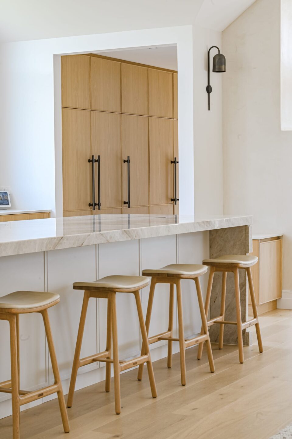 These deep-bronze accents are not only beautiful in their own right, but they also help to frame and highlight the refined use of materials used in this building — the pale wood of the cabinetry and flooring, the off-white walls and tiling, and the stone elements such as on the island and breakfast bar.