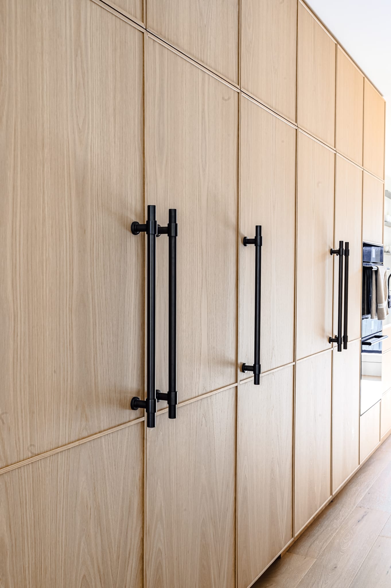 In Iver’s Signature Brass finish, the Helsinki Pull Handles and Cabinet Pulls, as well as the Osaka Cupboard Knobs, feature frequently, on cabinetry — some even concealing appliances — in the open plan kitchen, and in the bathrooms. The Rectangular Sliding Door Pull Passage Kit creates a sense of calm symmetry on sliding doors leading into the dining room.