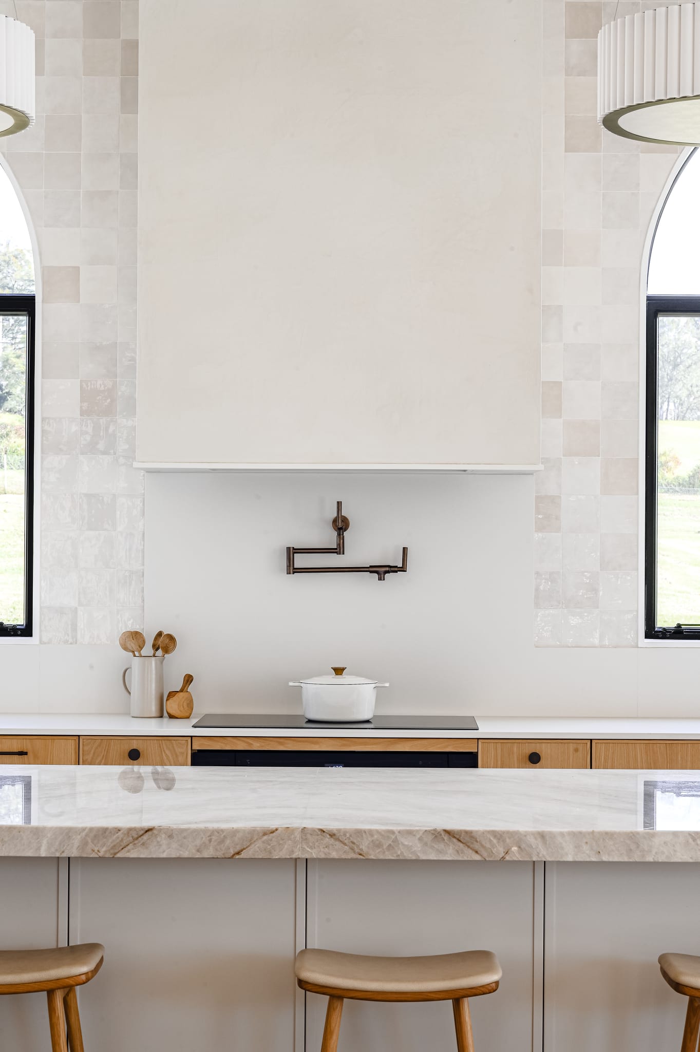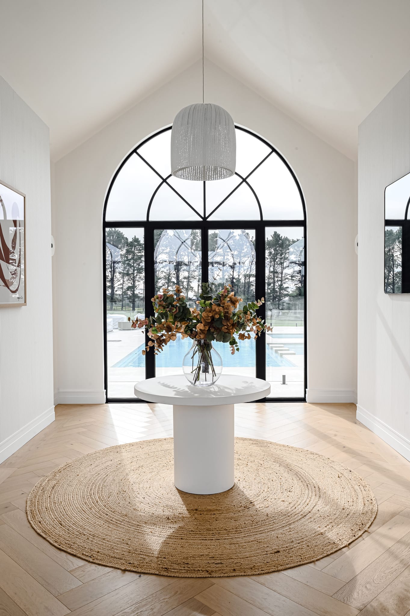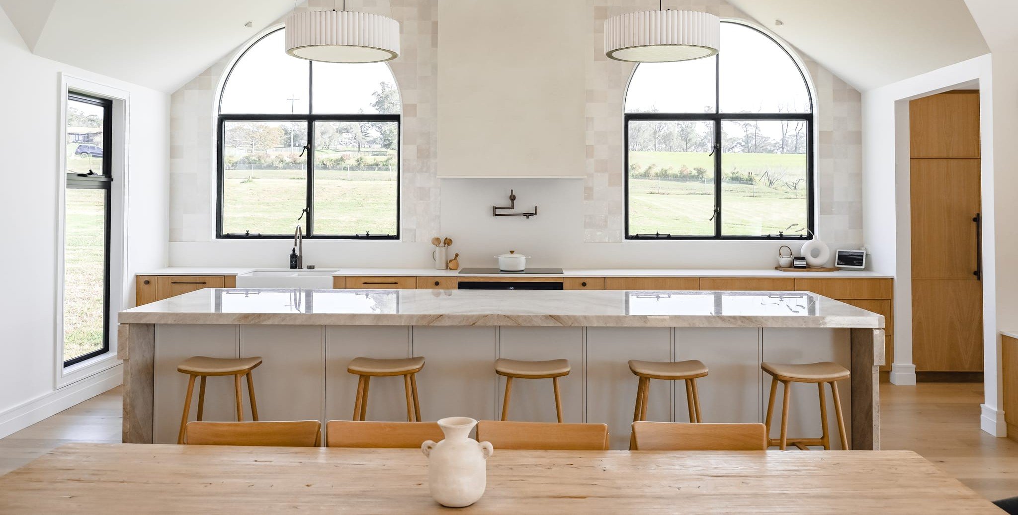 Jess Hunter Interior Design and Built to Desire worked on the building, working to a brief that requested a “neutral colour palette with modern farmhouse/Scandinavian vibes,” say Built to Desire. To achieve this, the teams have combined a clever medley of recurring shapes, the effect of which form an interior which feels balanced and calm. Long, horizontal lines are repeated across kitchen cabinetry, shelving and cantilevered vanities, while archways form windows and entries; even shower doors, all bordered with contemporary black framing.