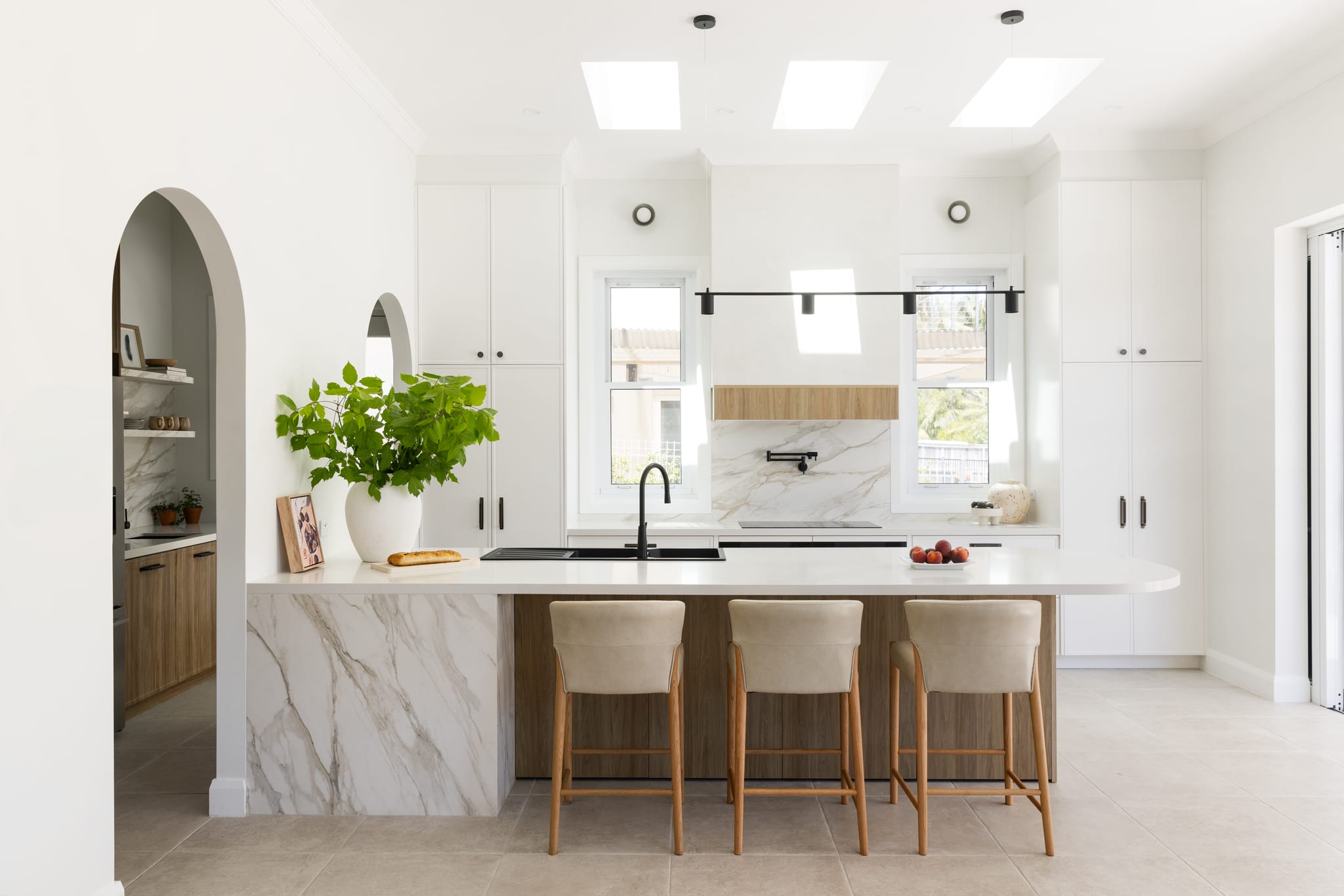 She describes the design as ‘Modern Coastal.’ With her practice situated on Sydney’s Northern Beaches, the sea is imbued into the aesthetic—creams and off-whites, with hints of pale blue scattered about. “I drew inspiration from our seaside surroundings as well as travels through the Californian coast and the Mediterranean,” says Paterson. “The design is intentionally restrained, with a neutral, layered palette and a strong focus on materials, detail and warmth-adding elements.”