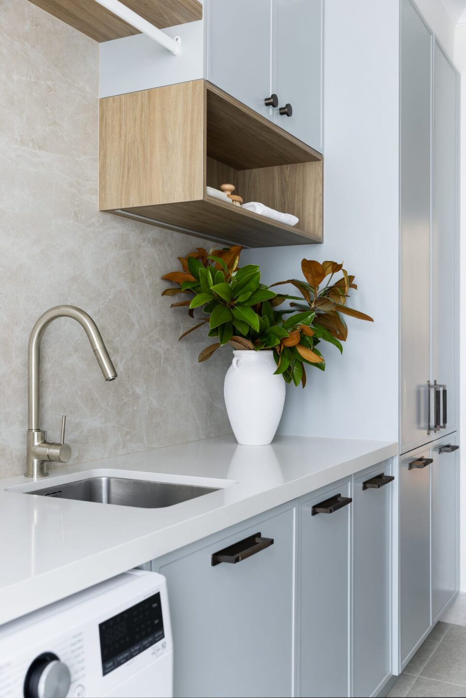 Sally scheduled both the Osaka Cupboard Knob in Signature Brass and the Berlin range’s Lever Oval in Matt Black in The Avenue, but it’s Iver’s backplates that are a highlight, with Brunswick Cabinet Pulls with Backplates in Satin Nickel, Matt Black, Signature Brass and Polished Chrome featured throughout her home. “I adore the backplates. On both the cabinetry and door handles it was exactly the level of detailing I was looking for. And the main colour I used, Signature Brass, is softer than black but still punctuates the cabinetry with contrast. I love that.”